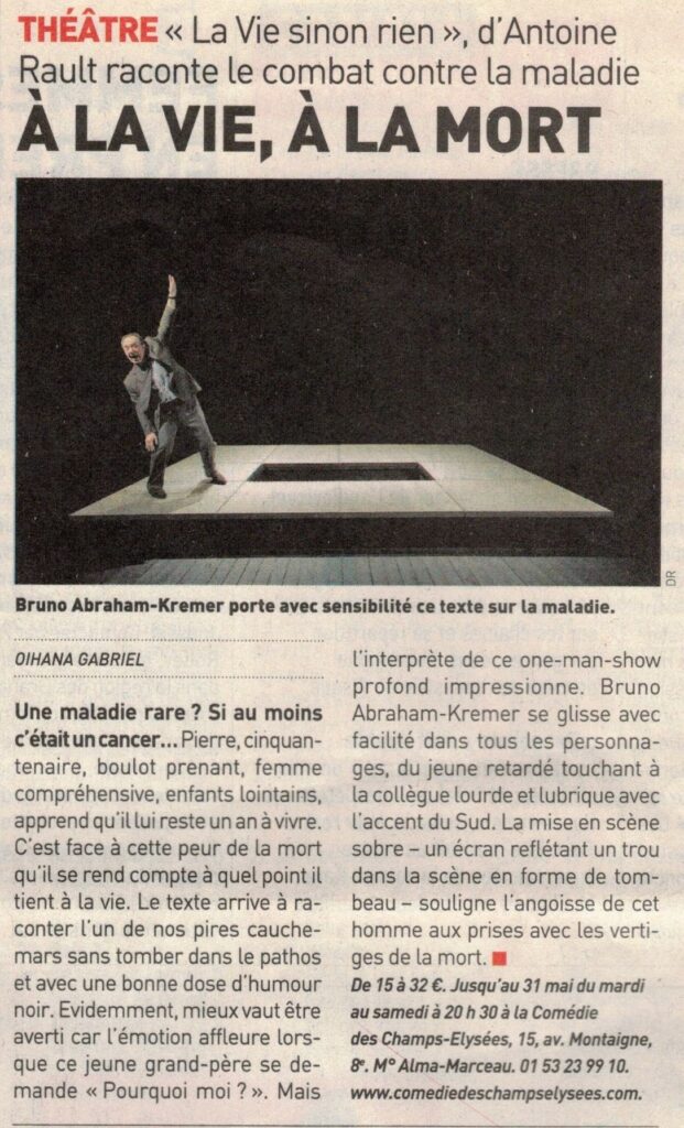 « Le texte arrive à raconter l’un de nos pires cauchemars sans tomber dans le pathos… » Mai 14, 2009 | La vie sinon rien, Pièces de théâtre / Theater Plays | 0 commentaires Oihana Gabriel Poster le commentaire Annuler la réponseVotre adresse e-mail ne sera pas publiée. Les champs obligatoires sont indiqués avec *Commentaire * Nom * E-mail * Site web Enregistrer mon nom, mon e-mail et mon site dans le navigateur pour mon prochain commentaire.