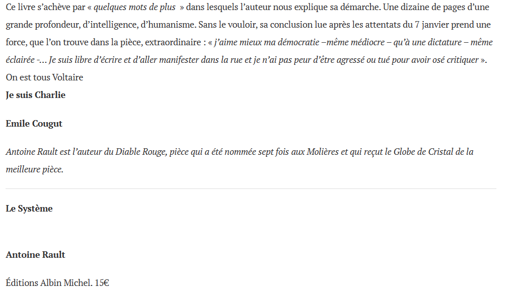 « Jan 10, 2015 | Le Système, Pièces de théâtre / Theater Plays | 0 commentaires Emile Cougut, blog « Wukali » Poster le commentaire Annuler la réponseVotre adresse e-mail ne sera pas publiée. Les champs obligatoires sont indiqués avec *Commentaire * Nom * E-mail * Site web Enregistrer mon nom, mon e-mail et mon site dans le navigateur pour mon prochain commentaire.