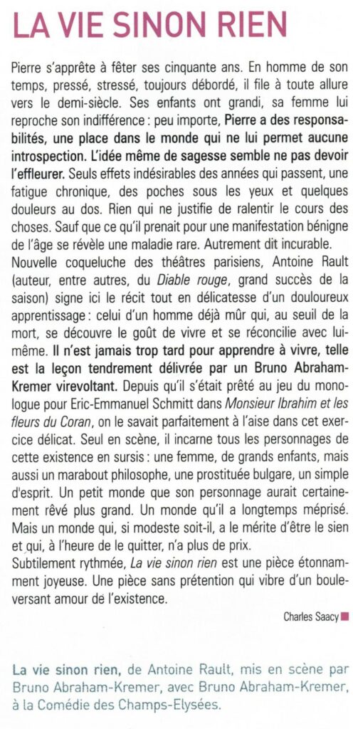 « Antoine Rault… signe ici le récit tout en délicatesse d’un douloureux appretissage… » Juin 1, 2009 | La vie sinon rien, Pièces de théâtre / Theater Plays | 0 commentaires Charles Saacy Poster le commentaire Annuler la réponseVotre adresse e-mail ne sera pas publiée. Les champs obligatoires sont indiqués avec *Commentaire * Nom * E-mail * Site web Enregistrer mon nom, mon e-mail et mon site dans le navigateur pour mon prochain commentaire.