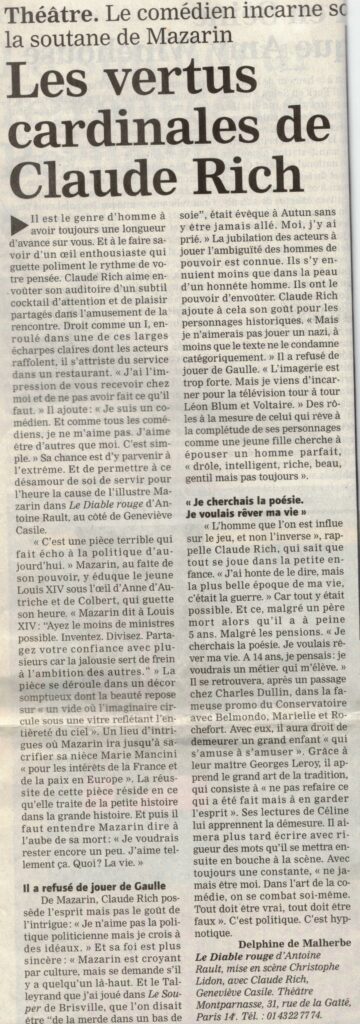 « La réussite de cette pièce réside en ce qu’elle traite de la petite histoire dans la grande histoire… » Août 31, 2008 | le Diable rouge, Pièces de théâtre / Theater Plays | 0 commentaires Delphine de Malherbe Poster le commentaire Annuler la réponseVotre adresse e-mail ne sera pas publiée. Les champs obligatoires sont indiqués avec *Commentaire * Nom * E-mail * Site web Enregistrer mon nom, mon e-mail et mon site dans le navigateur pour mon prochain commentaire.