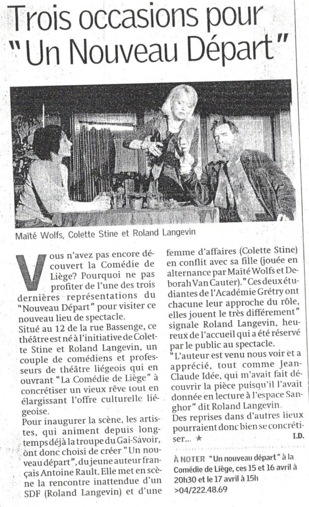 « L’auteur est venu nous voir et a apprécié… » Avr 14, 2005 | Pièces de théâtre / Theater Plays, Un nouveau départ | 0 commentaires Poster le commentaire Annuler la réponseVotre adresse e-mail ne sera pas publiée. Les champs obligatoires sont indiqués avec *Commentaire * Nom * E-mail * Site web Enregistrer mon nom, mon e-mail et mon site dans le navigateur pour mon prochain commentaire.