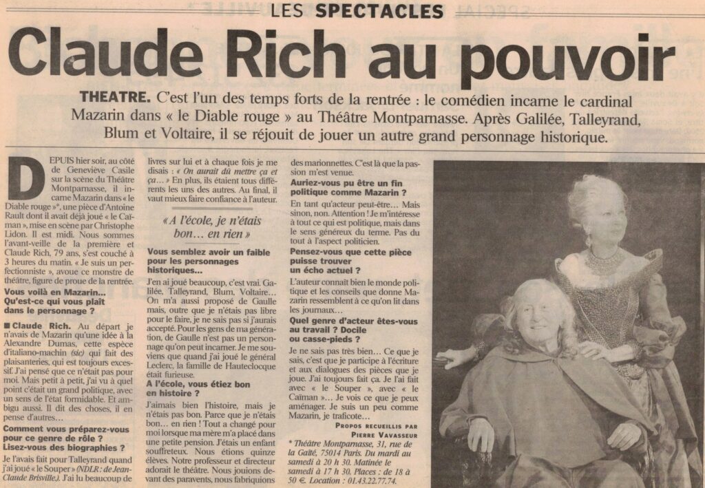 « Les conseils que donne Mazarin ressemblent à ce qu’on lit dans les journaux… » Sep 6, 2008 | le Diable rouge, Pièces de théâtre / Theater Plays | 0 commentaires Pierre Vavasseur Poster le commentaire Annuler la réponseVotre adresse e-mail ne sera pas publiée. Les champs obligatoires sont indiqués avec *Commentaire * Nom * E-mail * Site web Enregistrer mon nom, mon e-mail et mon site dans le navigateur pour mon prochain commentaire.