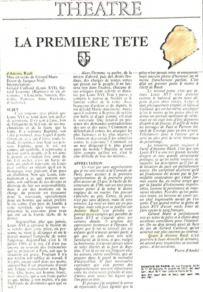 « Quant à Antoine Rault (c’est peut-être le Jean Anouilh de demain) on attend avec impatience sa seconde pièce… et les suivantes. » Mar 11, 1989 | La Première tête, Pièces de théâtre / Theater Plays | 0 commentaires R.O.C., Pierre d’ André Poster le commentaire Annuler la réponseVotre adresse e-mail ne sera pas publiée. Les champs obligatoires sont indiqués avec *Commentaire * Nom * E-mail * Site web Enregistrer mon nom, mon e-mail et mon site dans le navigateur pour mon prochain commentaire.