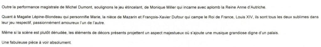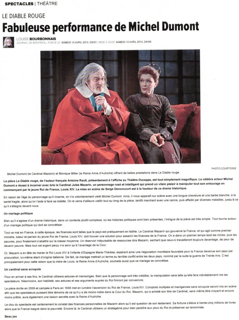 « Une fabuleuse pièce à voir absolument. » Avr 13, 2013 | le Diable rouge, Pièces de théâtre / Theater Plays | 0 commentaires Louise Bourbonnais Poster le commentaire Annuler la réponseVotre adresse e-mail ne sera pas publiée. Les champs obligatoires sont indiqués avec *Commentaire * Nom * E-mail * Site web Enregistrer mon nom, mon e-mail et mon site dans le navigateur pour mon prochain commentaire.