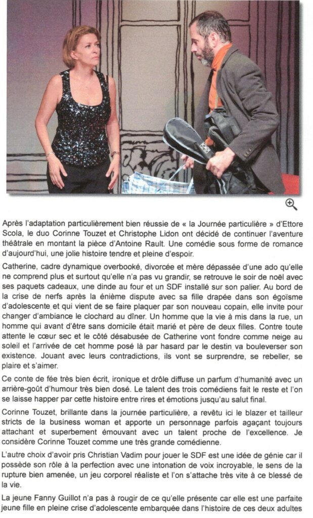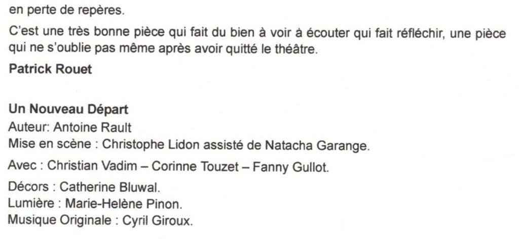 « Une jolie histoire tendre et pleine d’espoir… » Mar 6, 2016 | Pièces de théâtre / Theater Plays, Un nouveau départ | 0 commentaires Patrick Rouet Poster le commentaire Annuler la réponseVotre adresse e-mail ne sera pas publiée. Les champs obligatoires sont indiqués avec *Commentaire * Nom * E-mail * Site web Enregistrer mon nom, mon e-mail et mon site dans le navigateur pour mon prochain commentaire.