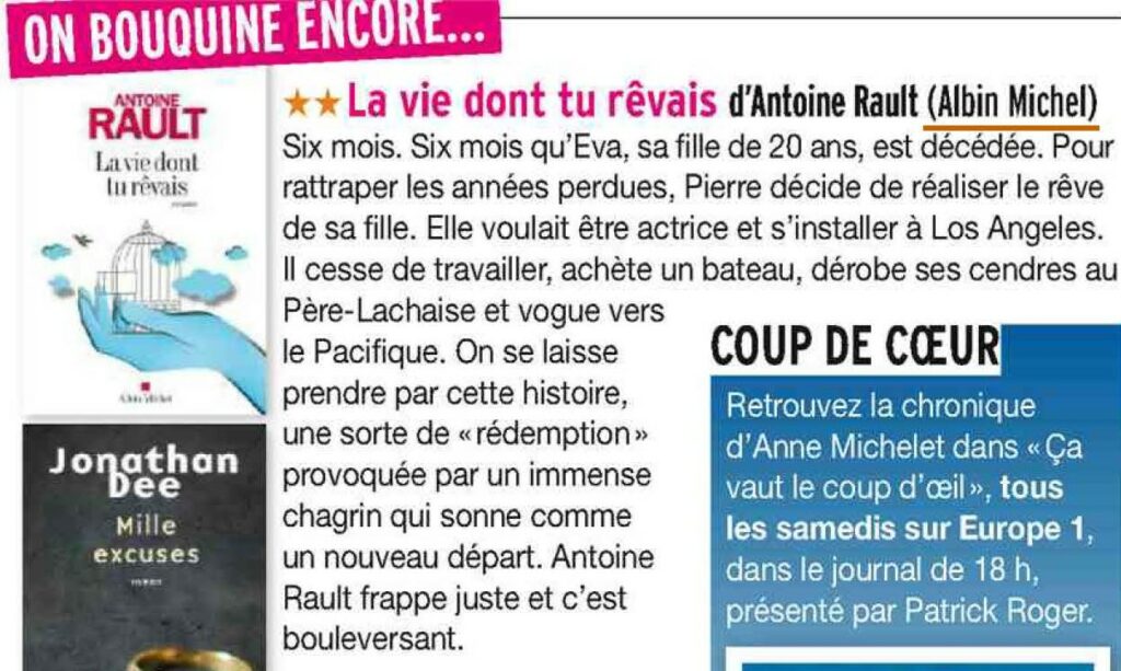 « Antoine Rault frappe juste et c’est bouleversant. » Mai 4, 2014 | La vie dont tu rêvais, Romans / Novels | 0 commentaires Poster le commentaire Annuler la réponseVotre adresse e-mail ne sera pas publiée. Les champs obligatoires sont indiqués avec *Commentaire * Nom * E-mail * Site web Enregistrer mon nom, mon e-mail et mon site dans le navigateur pour mon prochain commentaire.