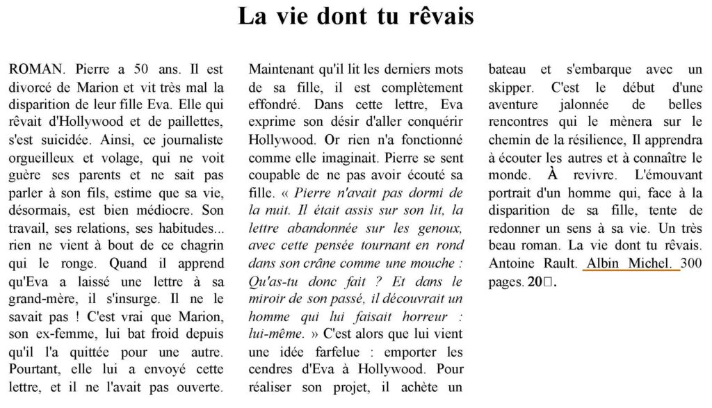 « L’émouvant portrait d’un homme qui, face à la disparition de sa fille, tente de redonner un sens à sa vie. » Mai 18, 2014 | La vie dont tu rêvais, Romans / Novels | 0 commentaires Poster le commentaire Annuler la réponseVotre adresse e-mail ne sera pas publiée. Les champs obligatoires sont indiqués avec *Commentaire * Nom * E-mail * Site web Enregistrer mon nom, mon e-mail et mon site dans le navigateur pour mon prochain commentaire.