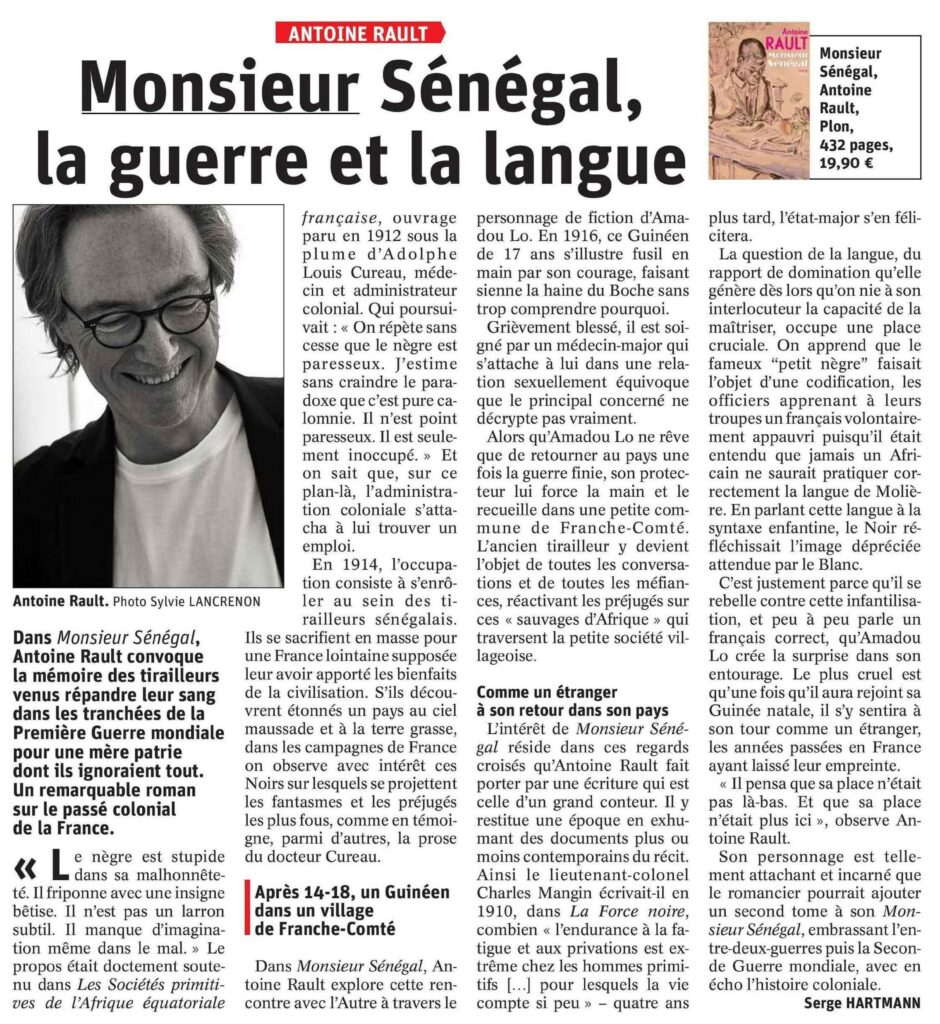 « L’intérêt de Monsieur Sénégal réside dans ces regards croisés qu’Antoine Rault fait porter par une écriture qui est celle d’un grand conteur… » Fév 3, 2023 | Monsieur Sénégal, Romans / Novels | 0 commentaires Serge Hartmann Poster le commentaire Annuler la réponseVotre adresse e-mail ne sera pas publiée. Les champs obligatoires sont indiqués avec *Commentaire * Nom * E-mail * Site web Enregistrer mon nom, mon e-mail et mon site dans le navigateur pour mon prochain commentaire.